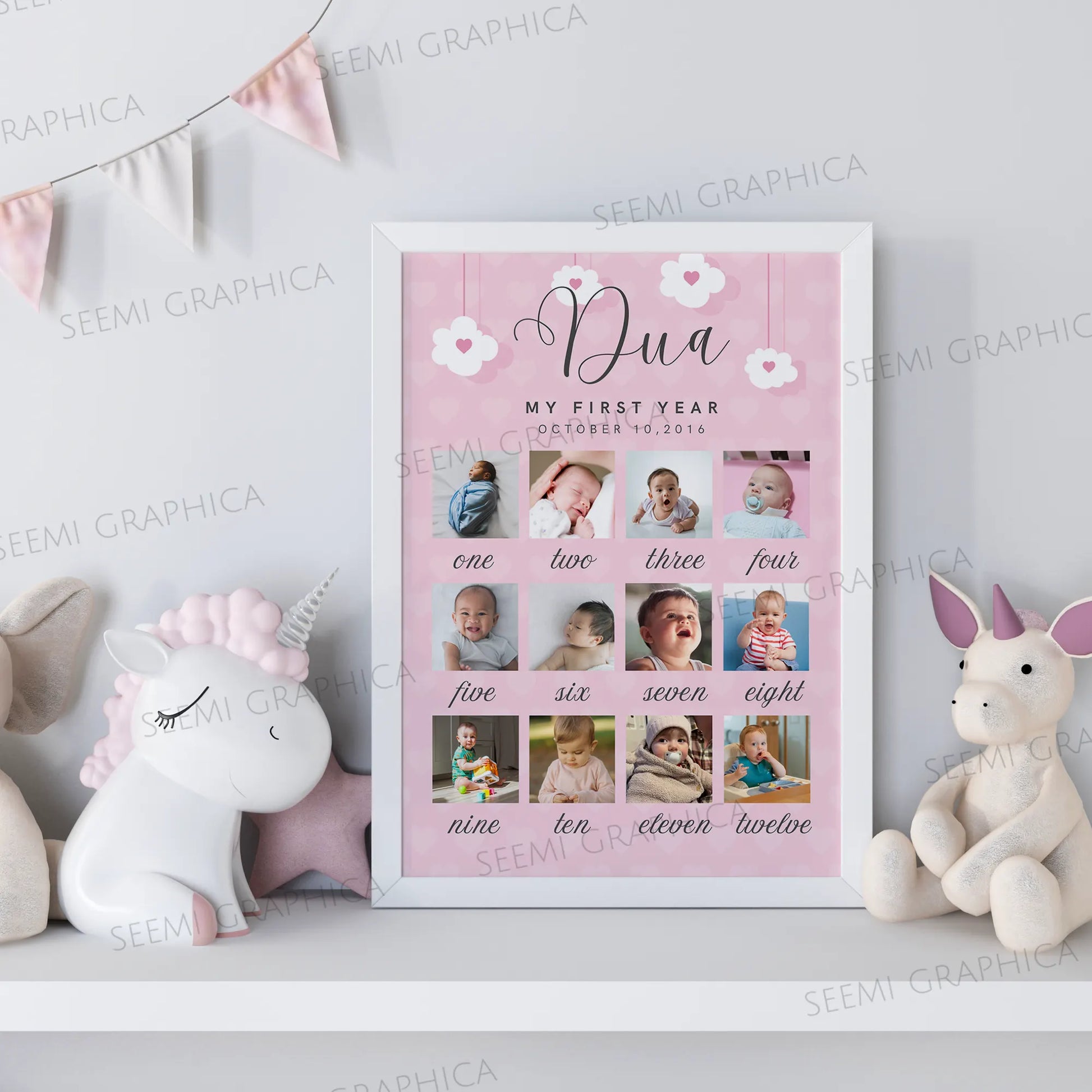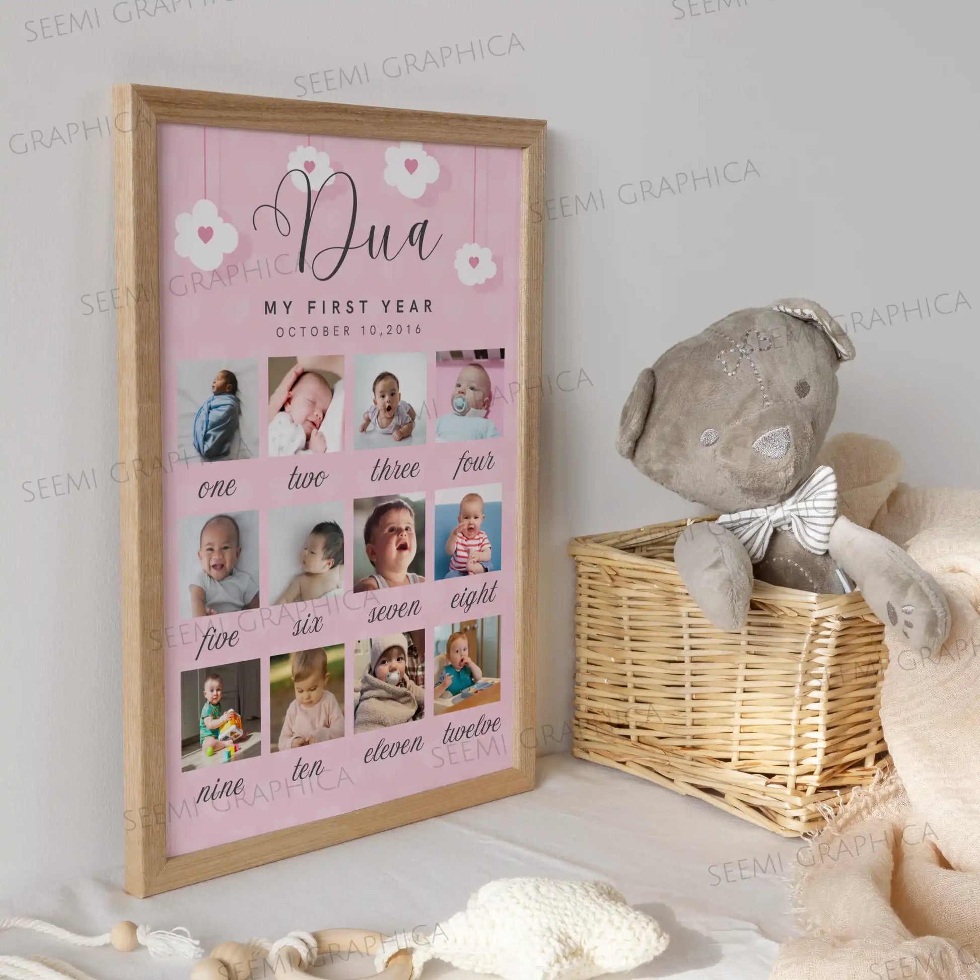 Capture your little one's journey through their first year with our Baby Milestone Photo Frame. With 12 photo slots, each depicting a different month, this frame is made with high-definition printing on top-quality material. Gender options include pink and blue for both baby boys and girls. Personalize your text to match the photo, a lovely addition to any nursery, a considerate baby shower gift, or a treasured keepsake.