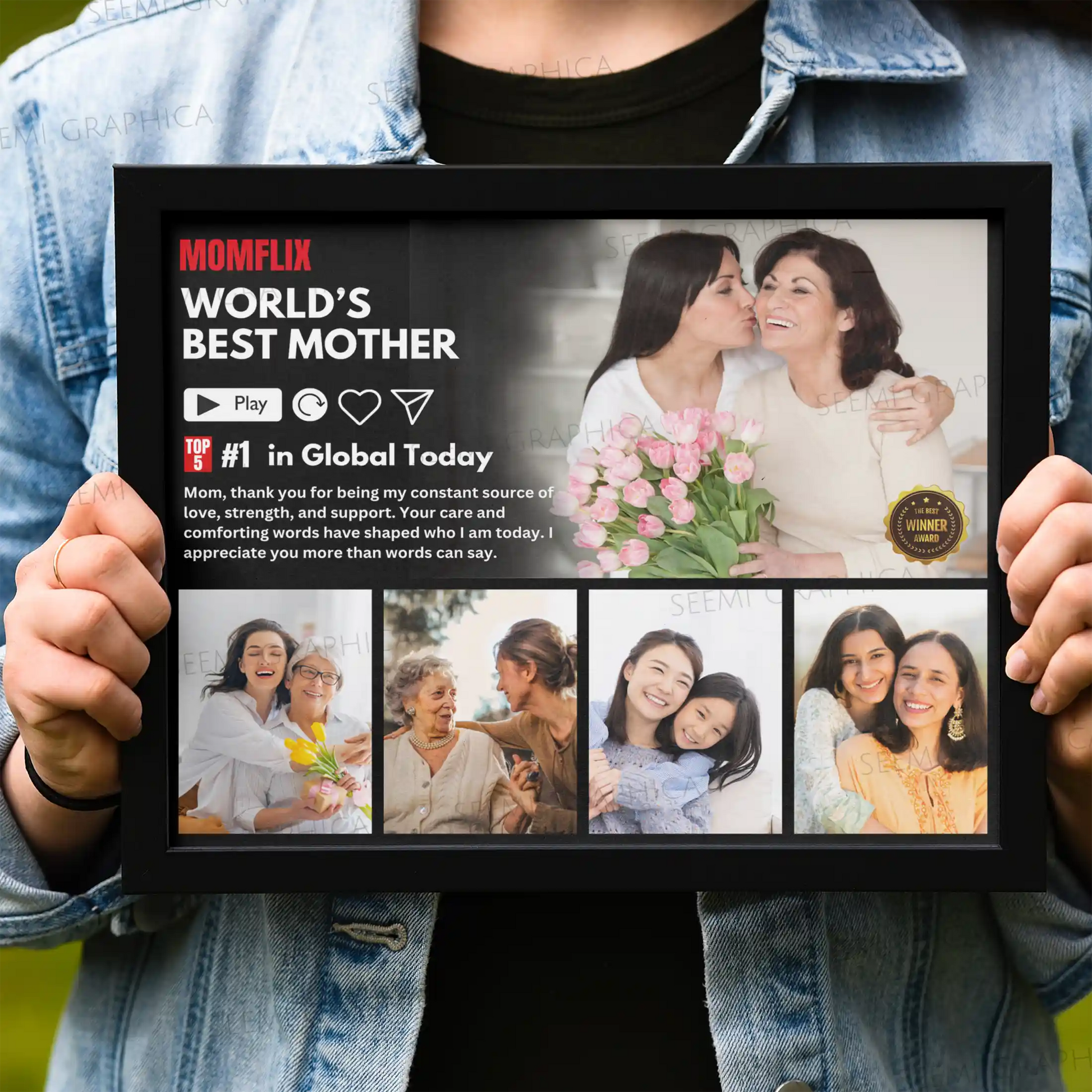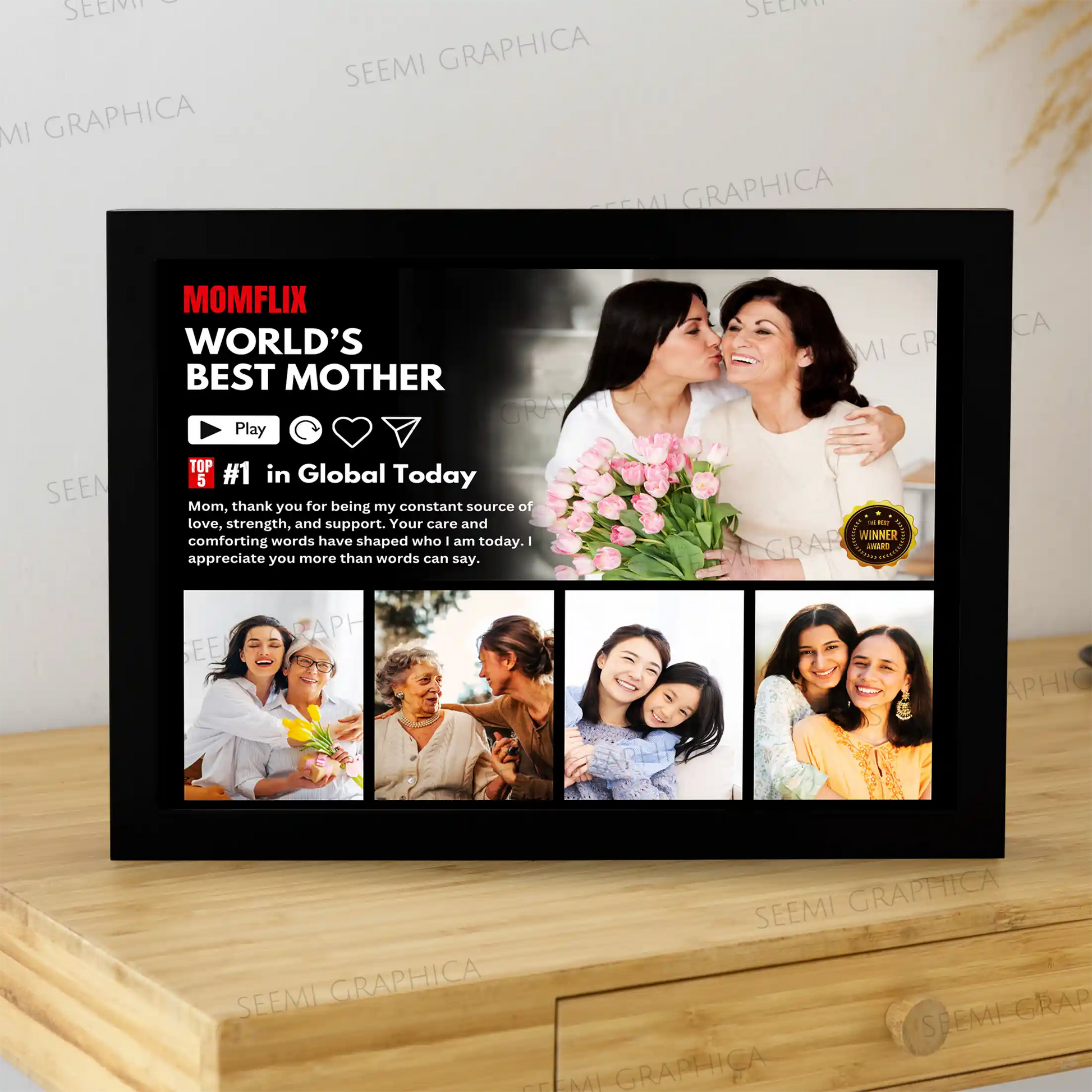 Looking for a heartfelt and creative gift just for Mom? This Custom MOMFLIX Photo Frame is the perfect surprise! Styled like the iconic Netflix interface, this one-of-a-kind frame features up to 5 of your favorite photos with your mom—turning precious memories into a fun, personalized keepsake. Whether it’s for Mother’s Day, her birthday, or just to say thank you, this frame is sure to make her smile and feel cherished.