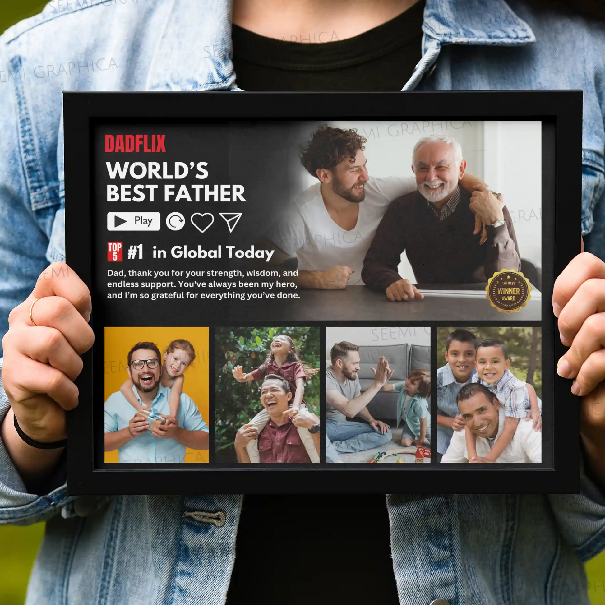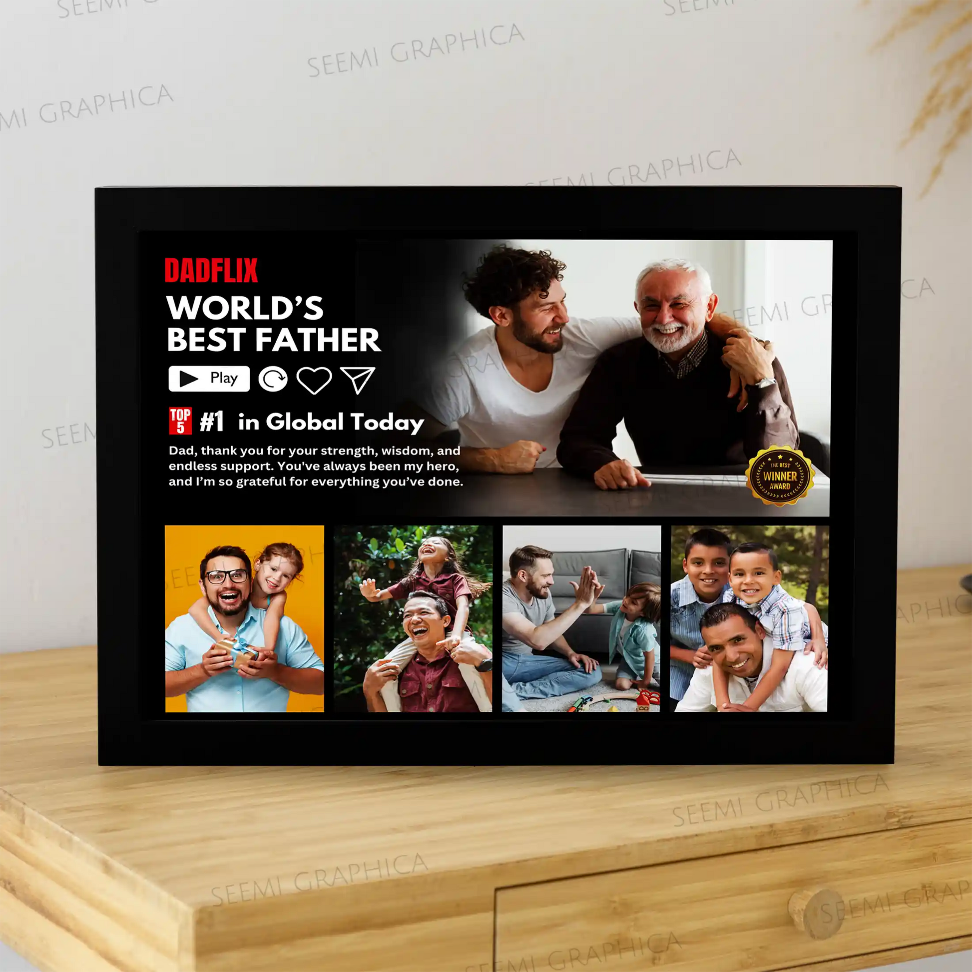 Looking for a heartfelt and creative gift just for Dad? This Custom DADFLIX Photo Frame is the perfect surprise! Styled like the iconic Netflix interface, this one-of-a-kind frame features up to 5 of your favorite photos with your dad—turning unforgettable moments into a fun, personalized keepsake. Whether it’s for Father’s Day, his birthday, or just to say thank you, this frame is sure to make him smile and feel appreciated.