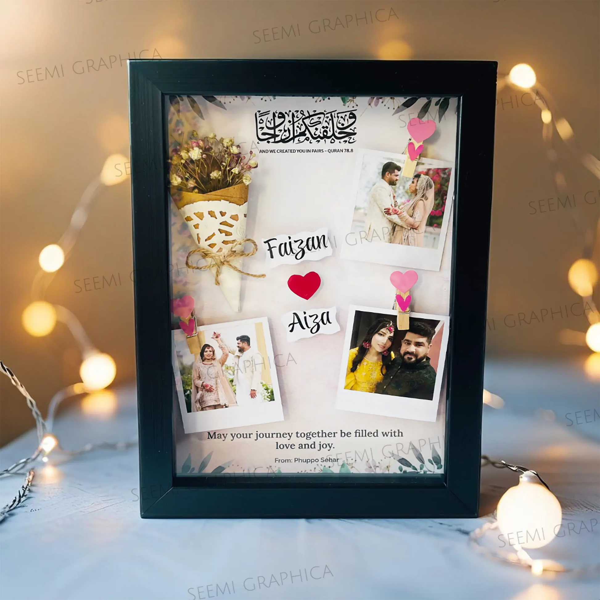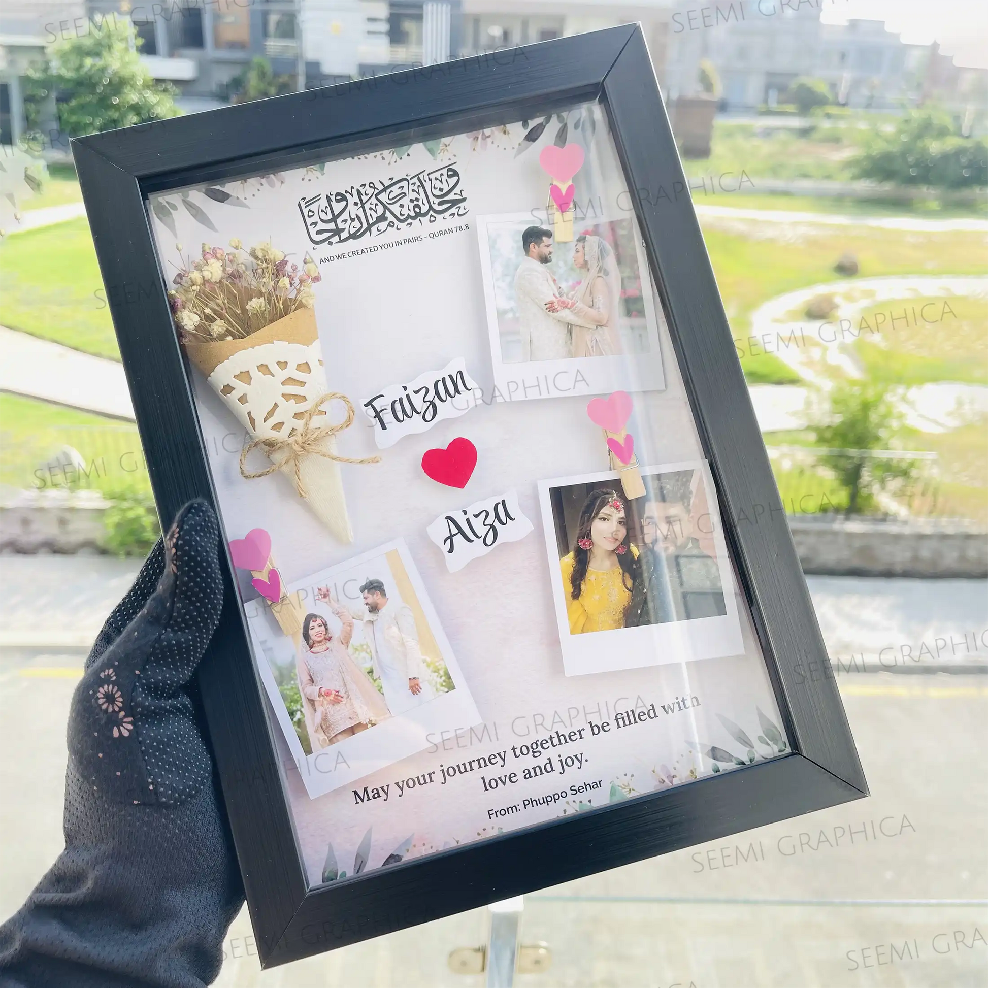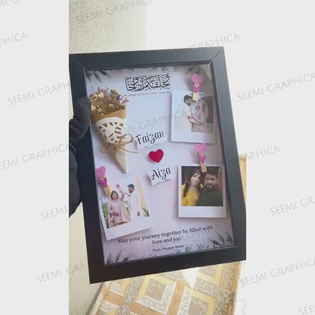 Capture your unforgettable moments and display them in a stunning way with this handmade 3D flower bouquet frame. Perfect for special occasions like weddings, anniversaries, and birthdays, this frame features delicately flowers and personalized engravings, along with 3 custom Polaroid-style images. Frame is crafted with love and care, preserving your most cherished memories in a beautiful and one-of-a-kind display.